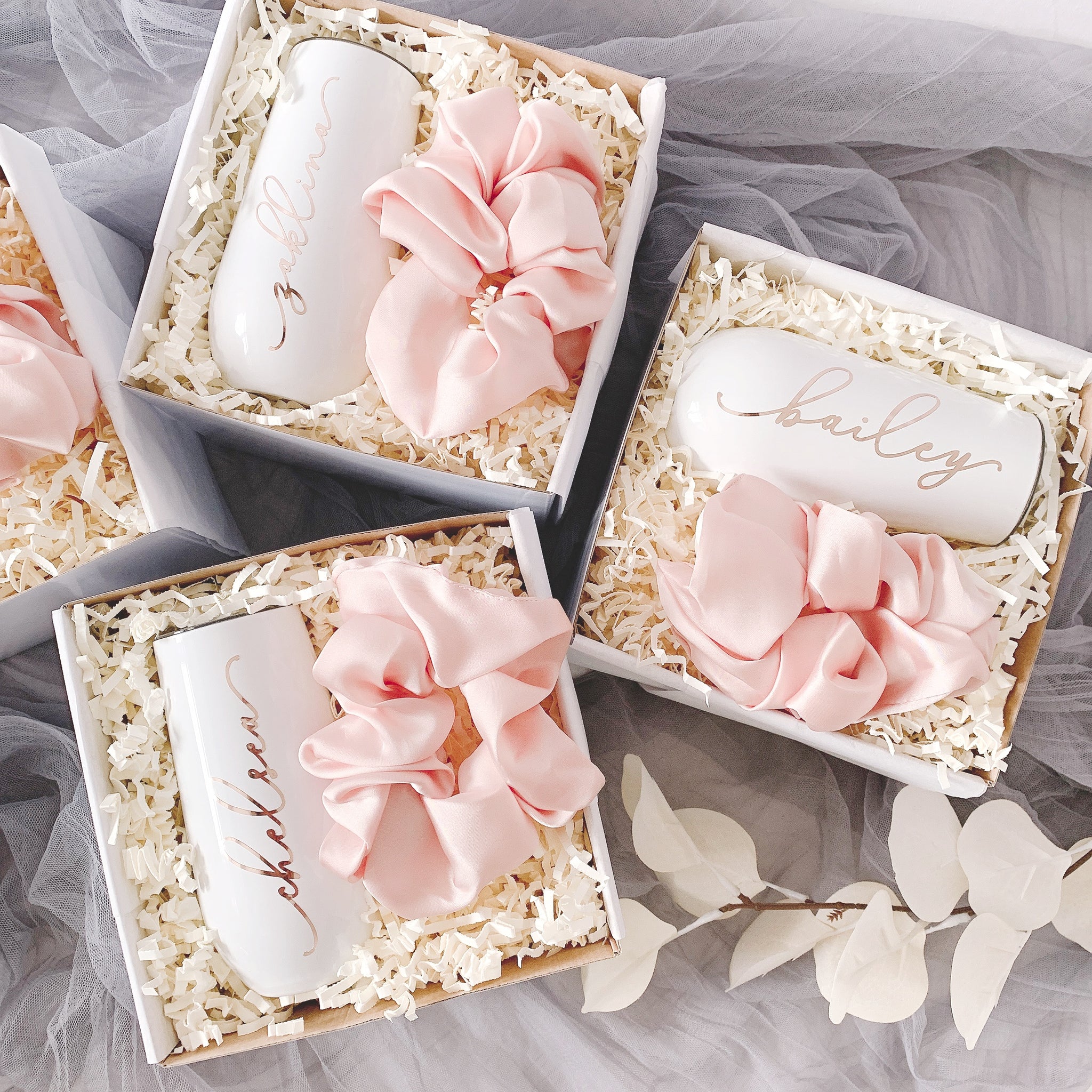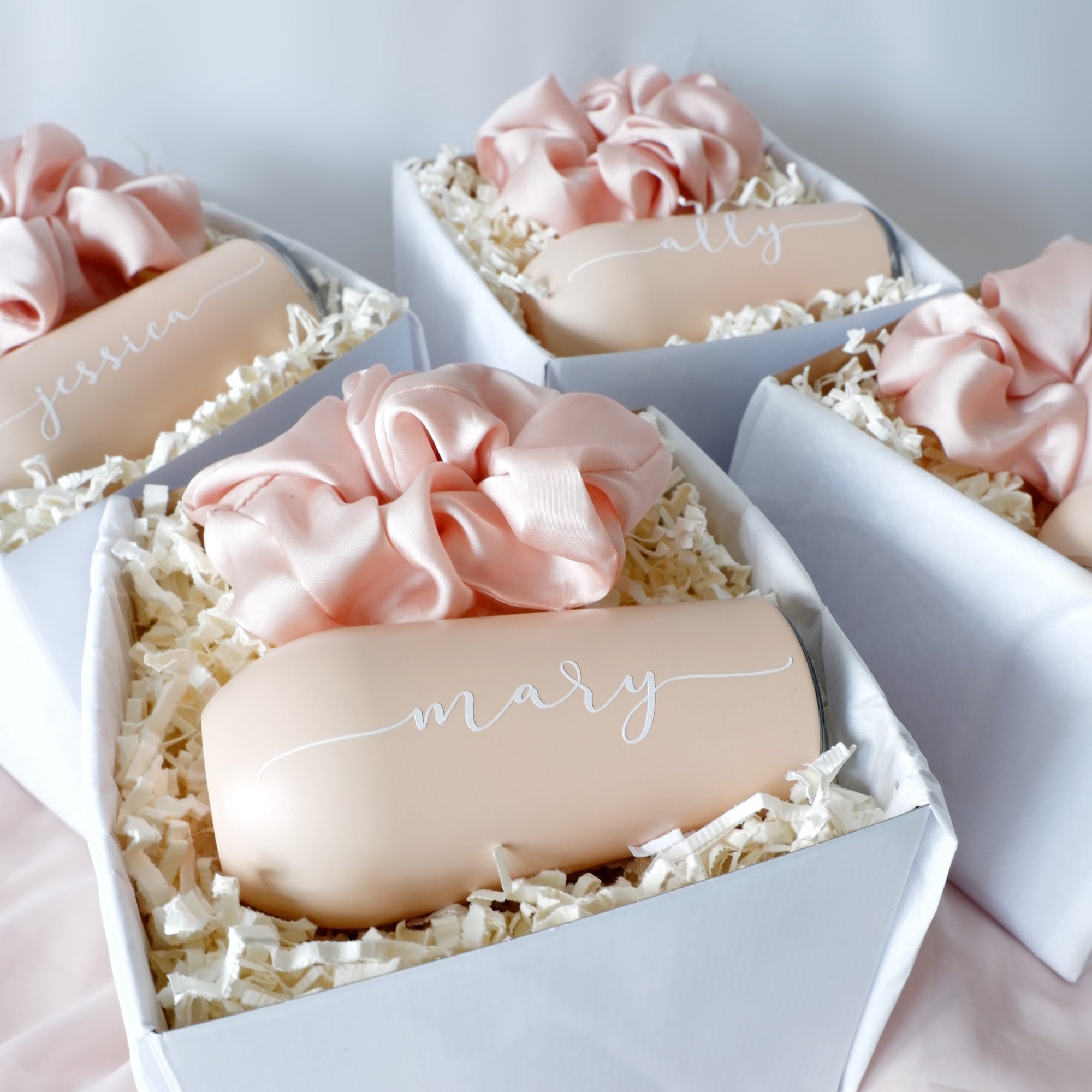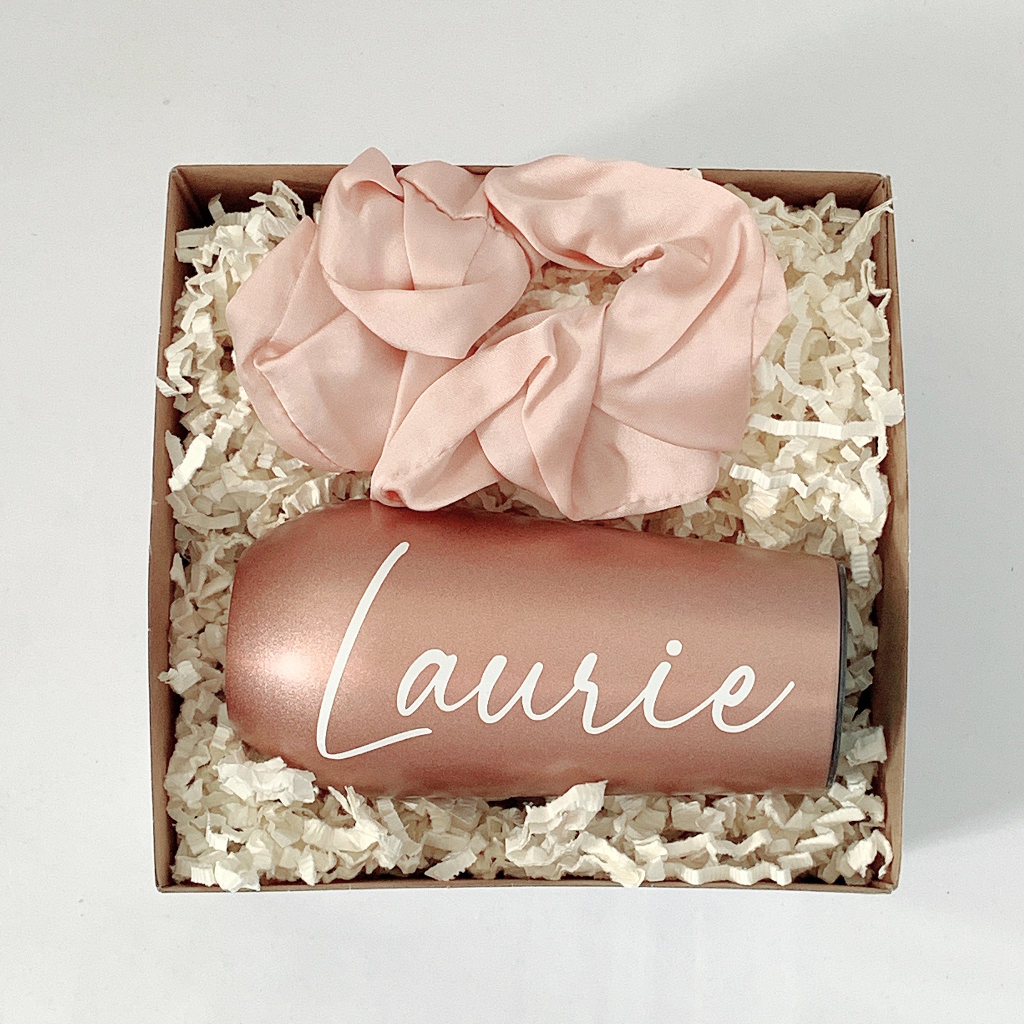 Send a memorable and luxurious gift that doesn't break the bank! Our signature personalized champagne tumbler along with a silk scrunchie is the perfect gift to celebrate any occasion.