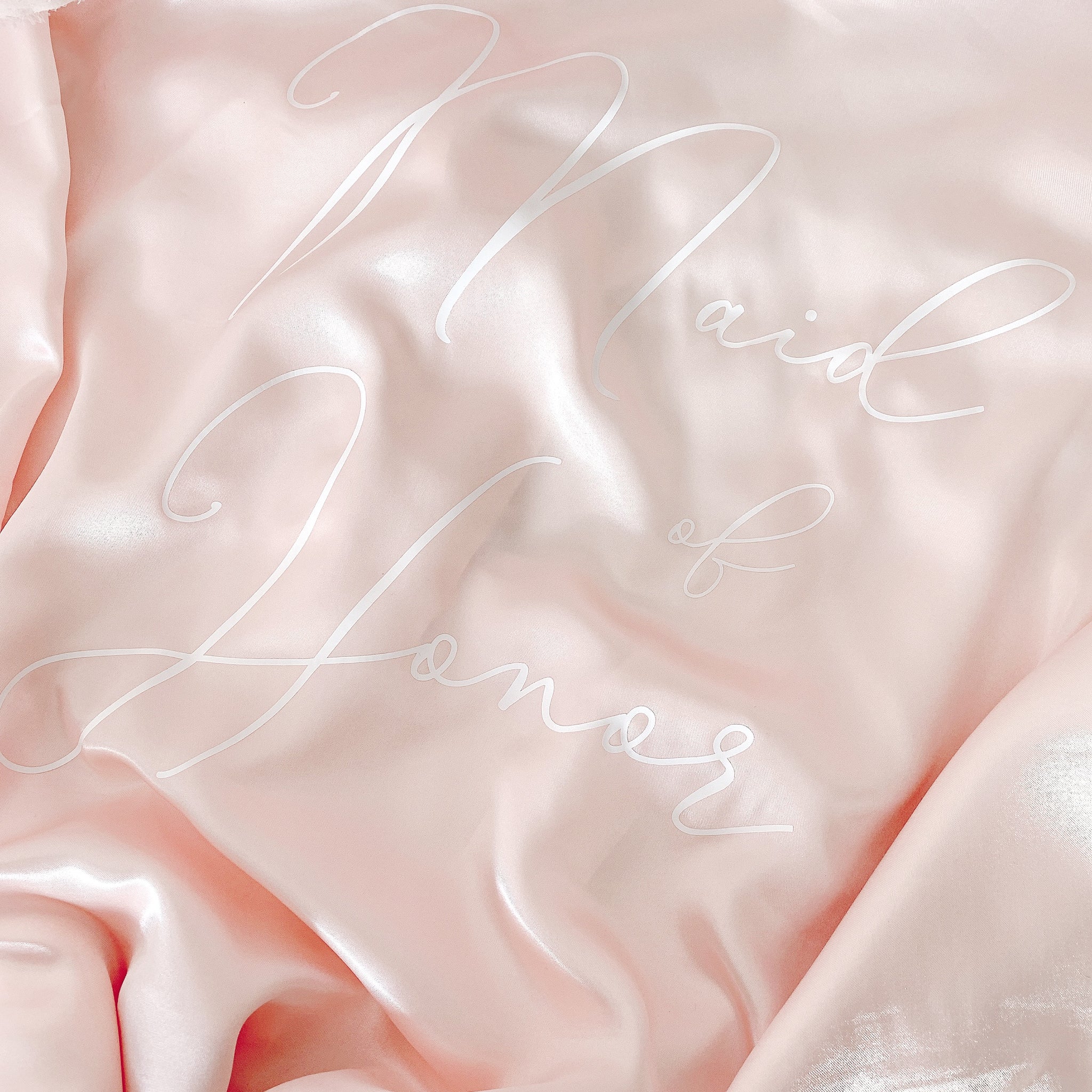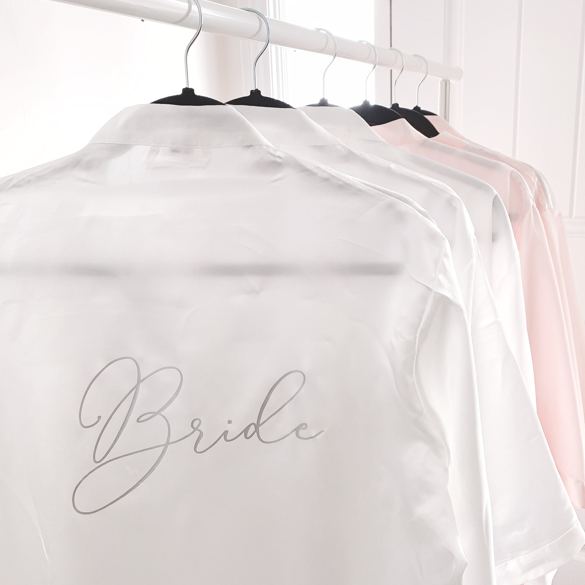 This satin kimono robe is the perfect combination of style and comfort. It is lightweight, silky smooth and comes with a matching belt. Great for everyday use or a gift for the bride or bridesmaids. Price includes a name or role on the back.
