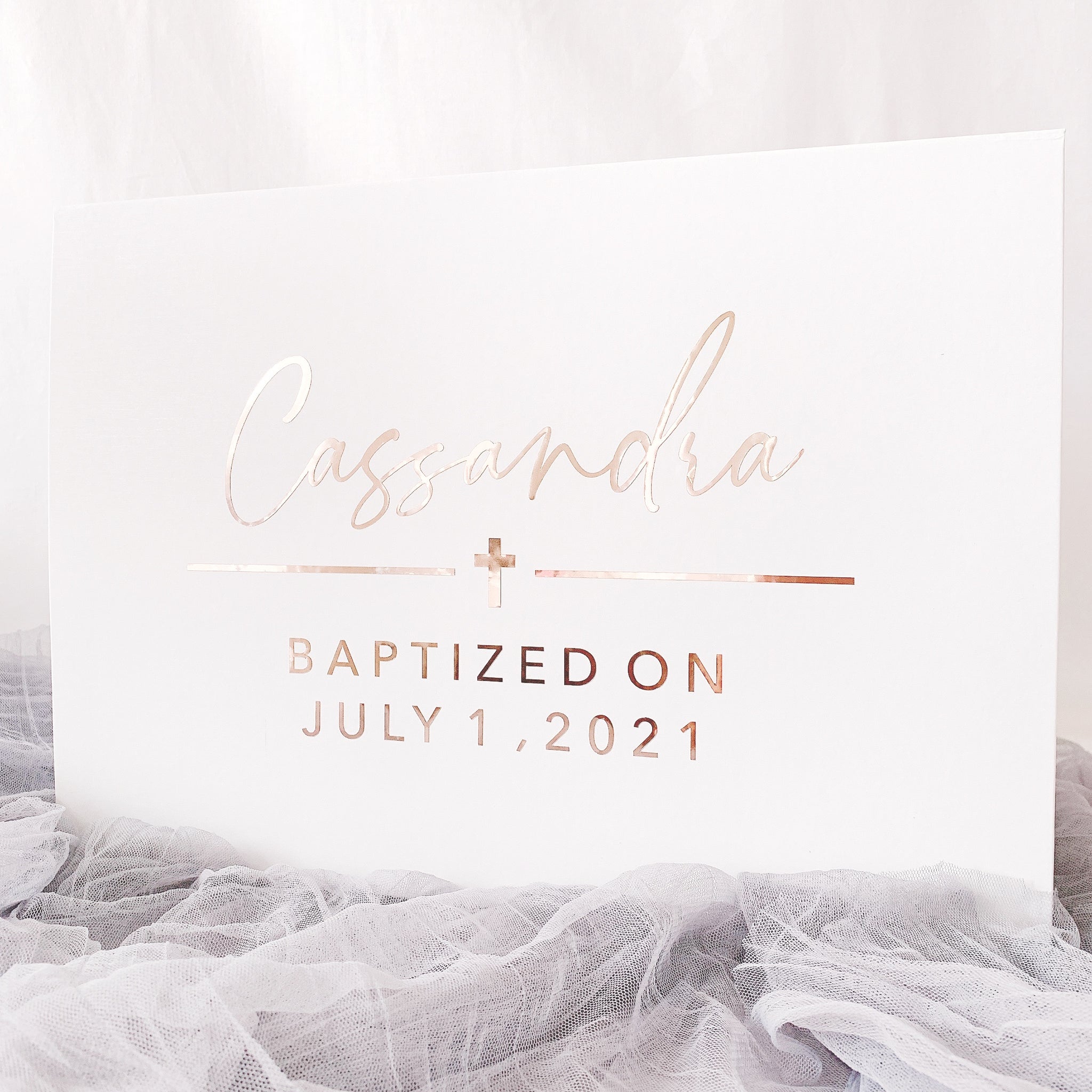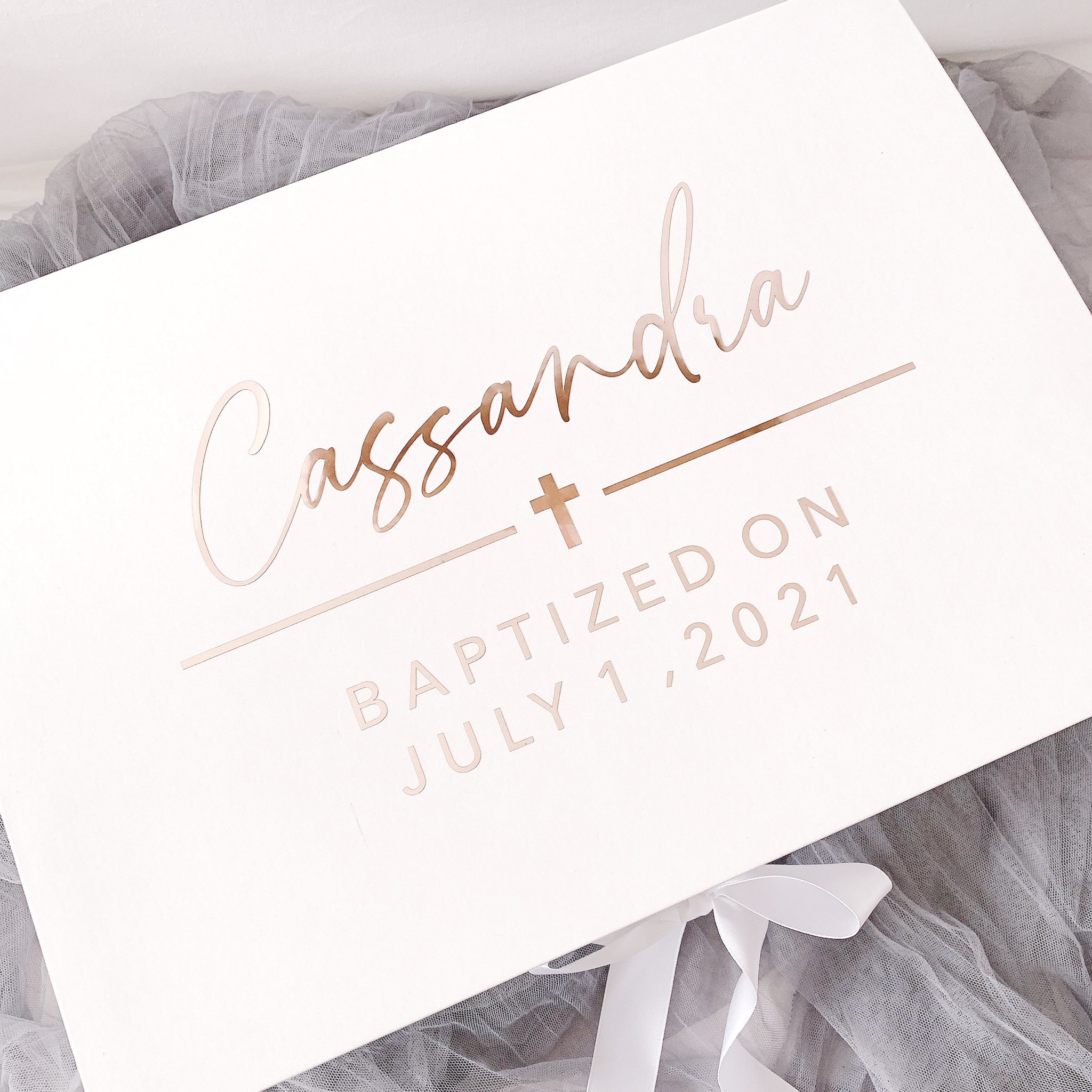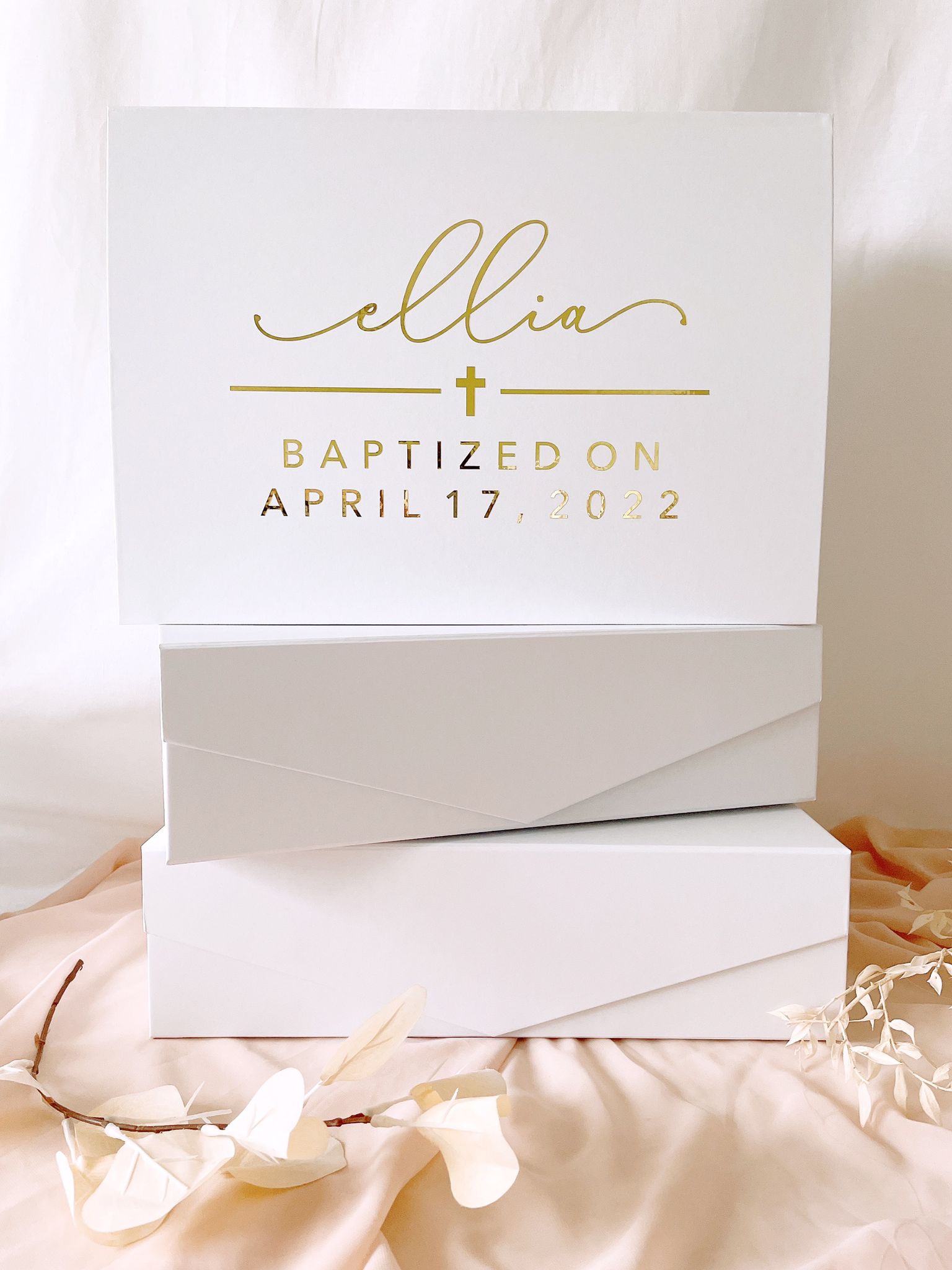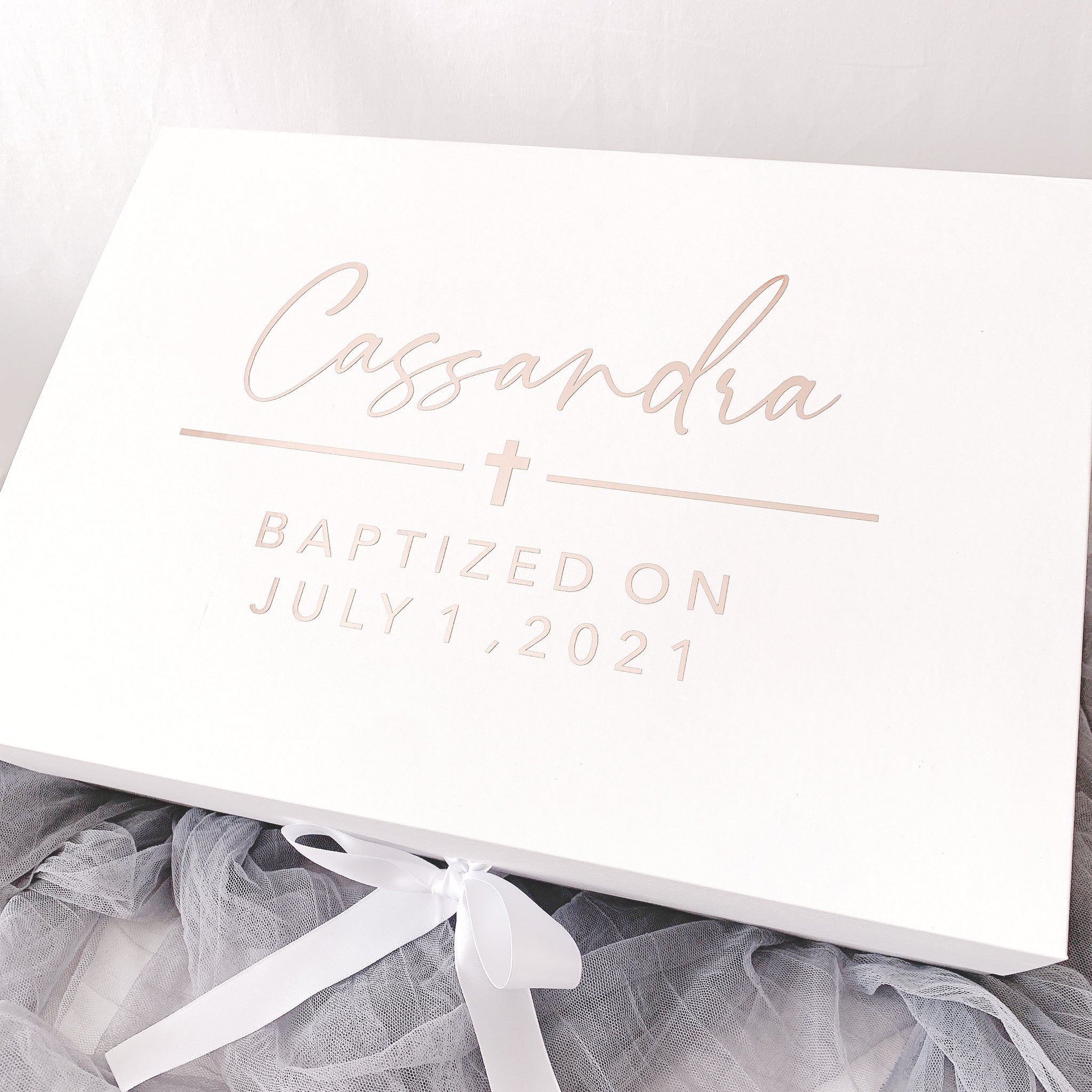This Classic box comes with a special baptism personalization, a ribbon and ships flat. It is easily stored, has a beautiful natural matte finish and is the perfect keepsake box for years to come.