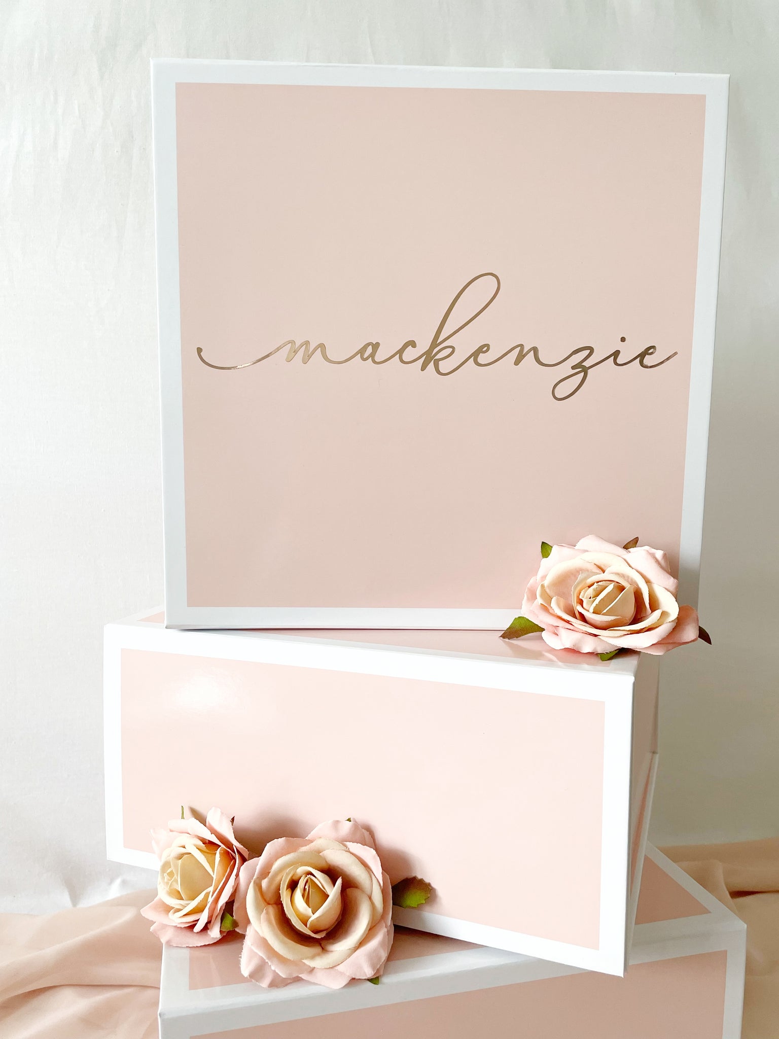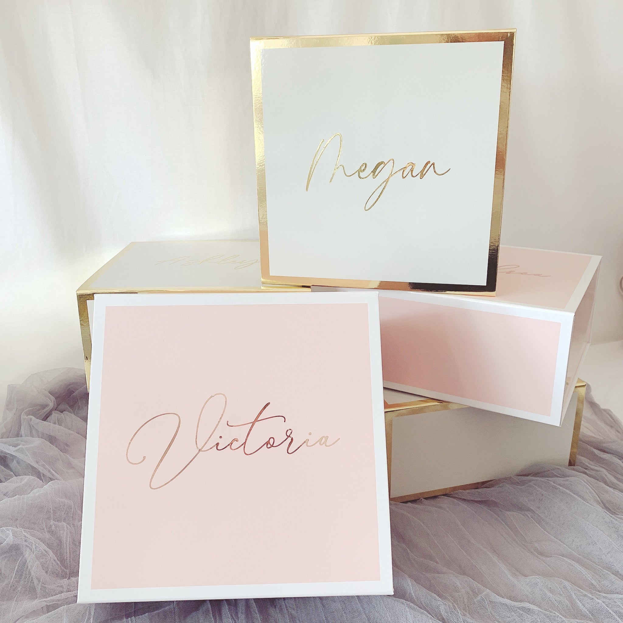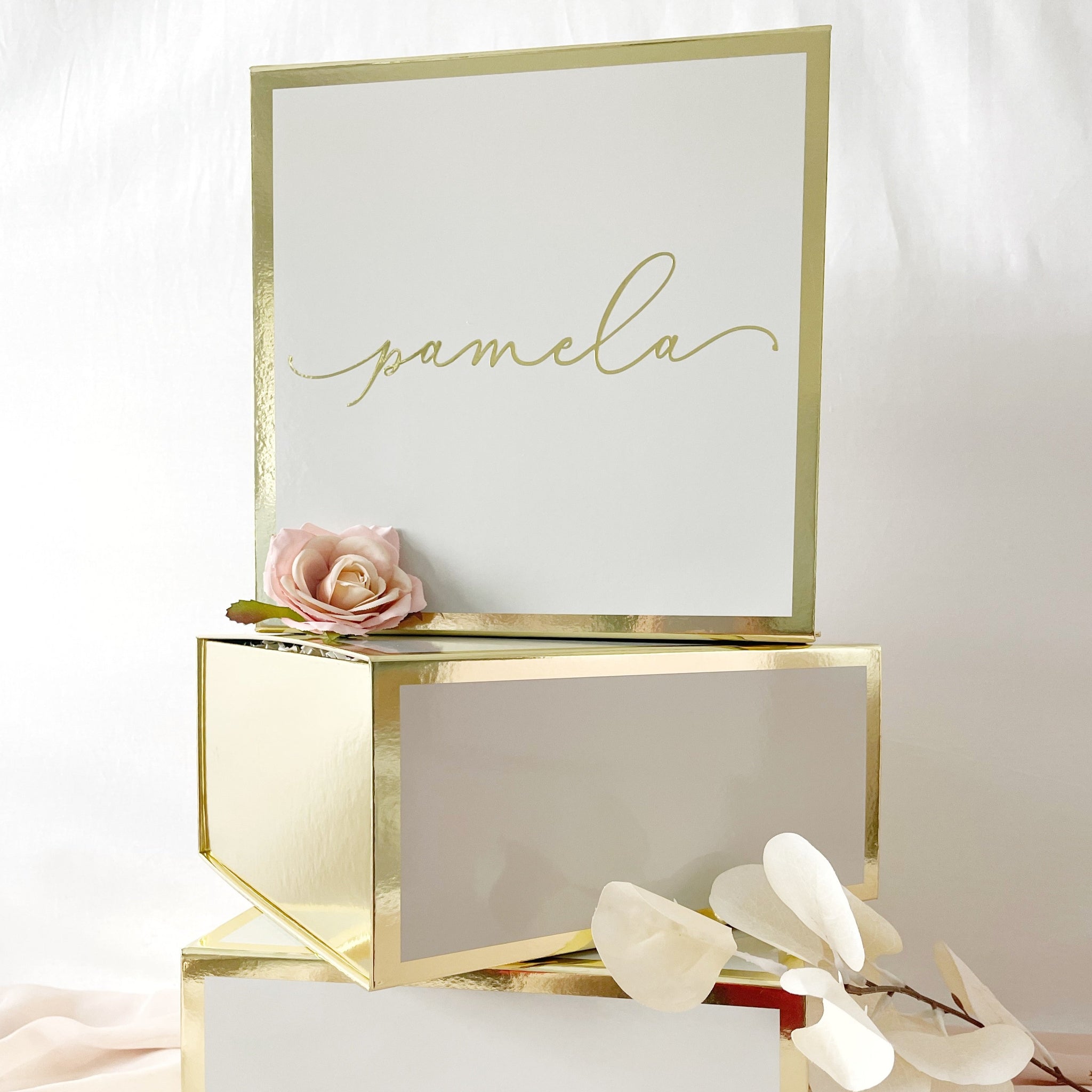 Beautiful high-end gloss finish boxes with magnetic closure. These boxes are chic and modern great for any occasion! A great option to travel with as it ships flat and can be easily assembled.