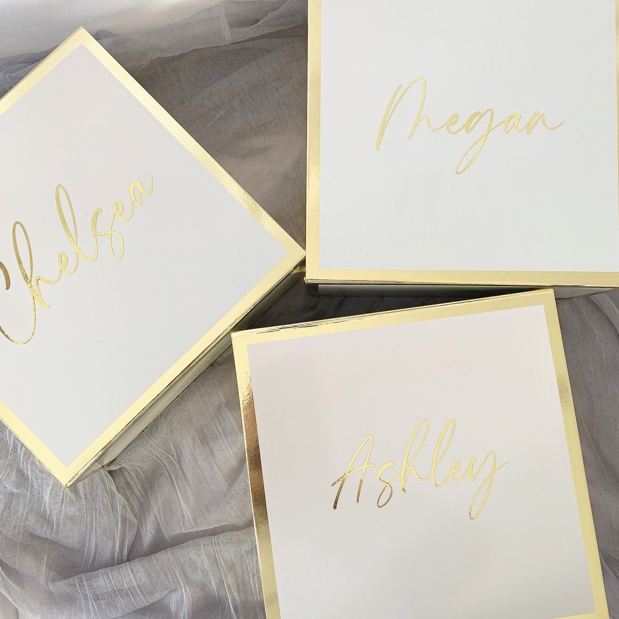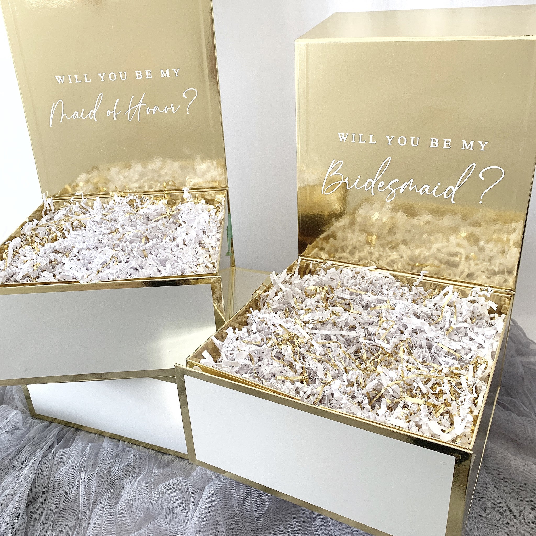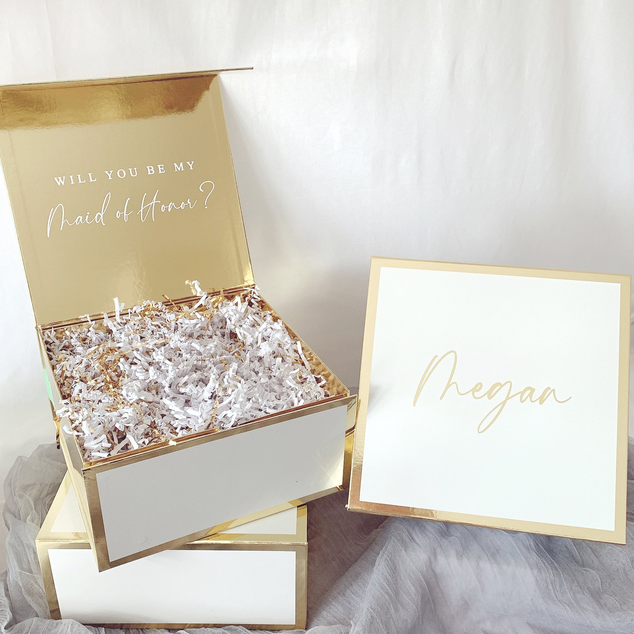 Beautiful high-end gloss finish boxes with magnetic closure. These boxes are chic and modern great for any occasion! A great option to travel with as it ships flat and can be easily assembled.