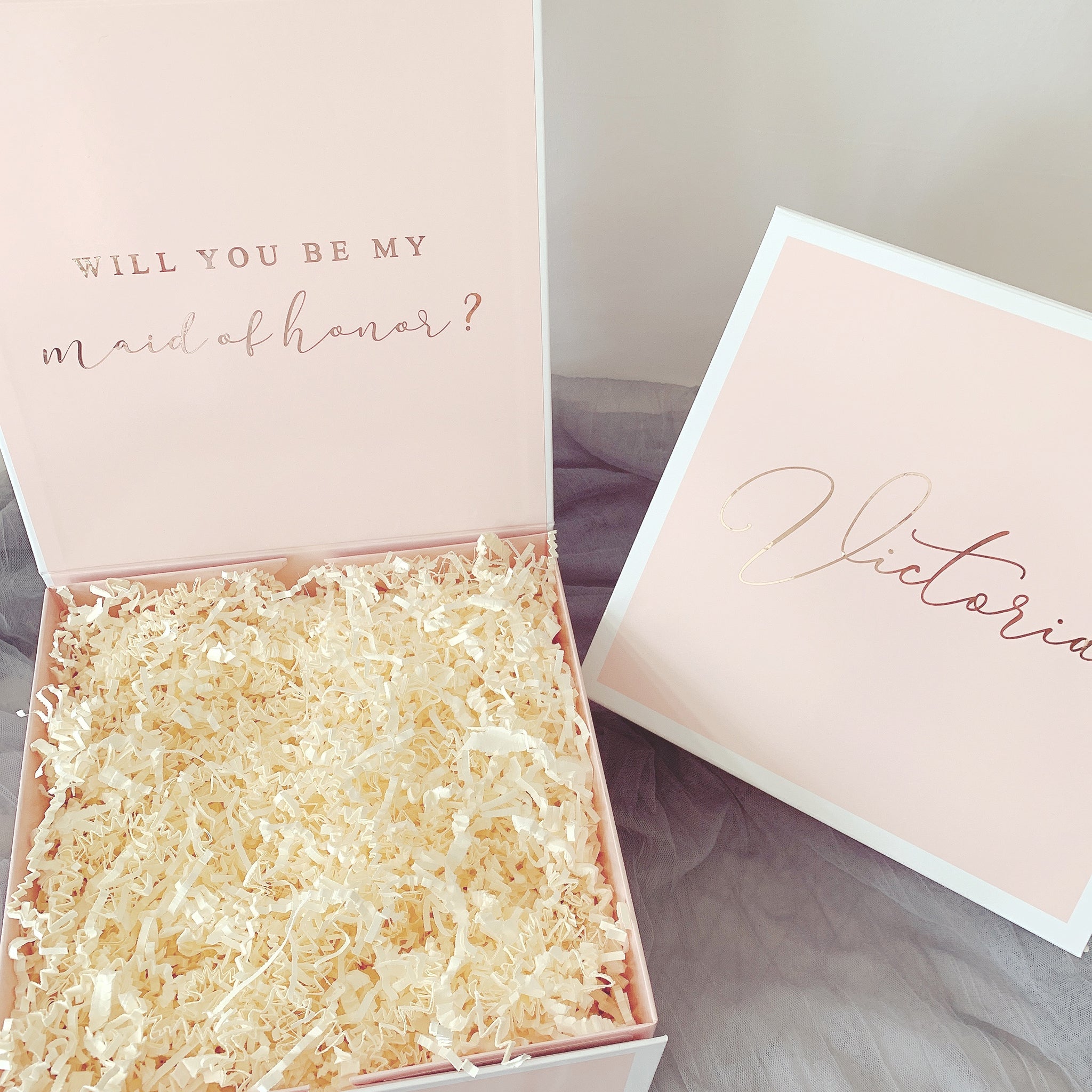 Pink + White Trim box personalization will all be done in rose gold.